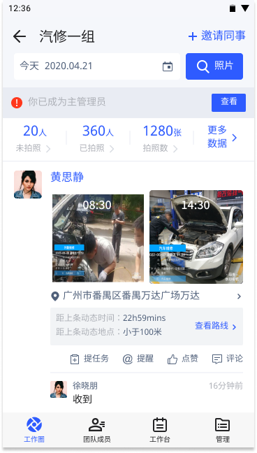 将同事拉近工作圈后,他们只需要使用马克水印相机拍照,照片就会自动实时同步到工作圈,并且这些照片会自动分析成各种数据,如员工拍照数据、考勤打卡数据、排班数据等等,而且上传的照片都可以查看和下载,都是存储到团队的相册内的,为日后工作的留存留证,追溯工作的源头留下影像。并且管理员可以看到团队内的工作情况、照片,方便进行工作的交流。