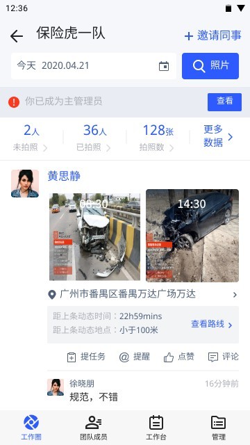 马克水印相机拍摄的照片可以自动同步团队,并且水印照片自动同步团队后,很好的解决照片甩微信群,很乱不容易查找的痛点。只需要翻看团队的照片即可了解当日的工作情况,并且团队内还可以进行任务的指派,使得整个工作环境形成闭环,每件事情都能轻松跟进。