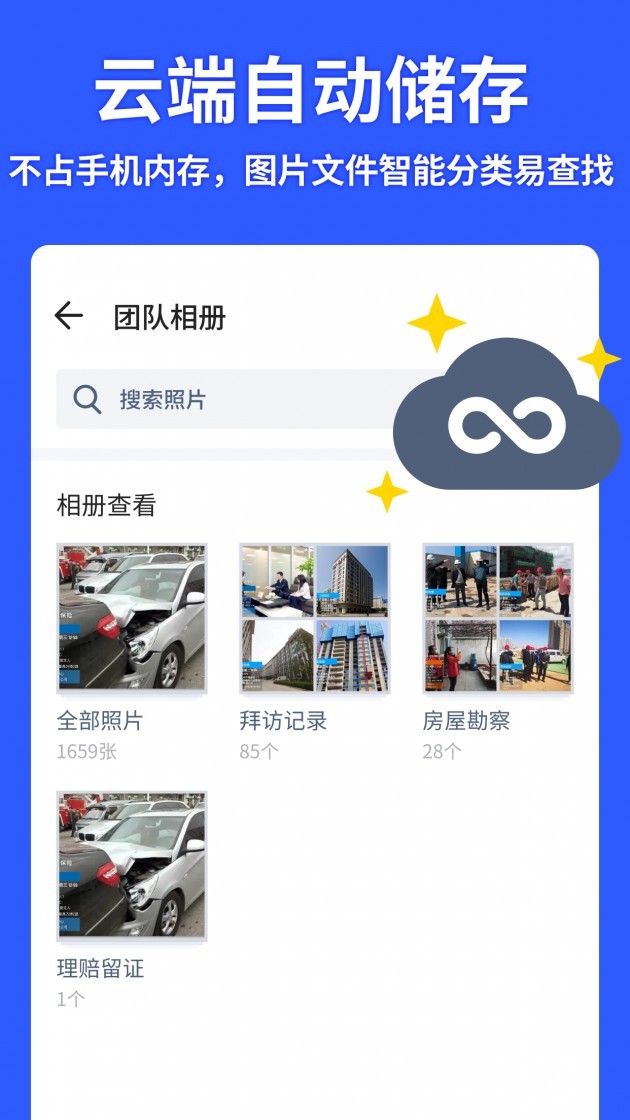 保险业务员拍的理赔现场高清照片、视频都会自动、免费存储到云端,并且这些都会根据水印类型、水印信息进行自动的分类存储,不但不占手机内存,而且特别容易查找,通过水印上的信息可以进行查找,非常方便。