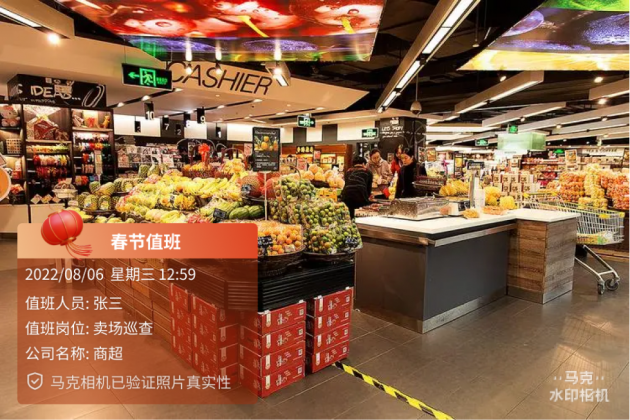 春节期间,大型超市管理人员要求值班工作人员需要对工作情况记录,并且反馈,因此,值班人员会对工作现场进行拍照记录,并通过微信发送,但是这种方式效率太低,信息反馈滞后。其实可以用马克水印相机拍照,照片自带时间地点等水印信息,并且能够实时上传云端,同步团队成员,有利于工作监督。