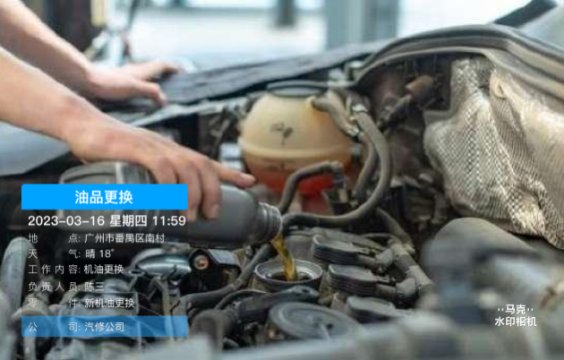随着智能手机的普及,许多油品更换在汽车维修过程中,经常需要拍照记录留底,但这种方法存在较大的问题是照片容易丢失,不好管理。为解决这种情况,可以用马克水印相机拍照,照片自带时间地点等水印信息,并且能够根据水印信息自动分类管理,方便溯源查询。