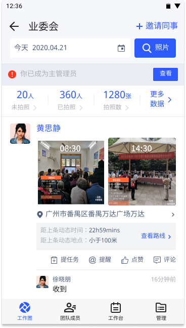 马克水印相机特有的团队工作圈,可用于日常工作照片的上传。照片会实时同步到工作圈,实现即时共享,工作的相关照片就像朋友圈一样展示,显示时间、人名、内容,可查看或下载相应的照片,也可以对某个照片进行评论提出修改意见,更有利于工作的开展和事件的溯源。值得一提的是,工作人员在做工作汇报时往往会把照片分享到微信、工作软件,这样很容易被其它消息刷走,而且翻查很麻烦,马克水印相机特有的团队工作圈可以解决这类问题。