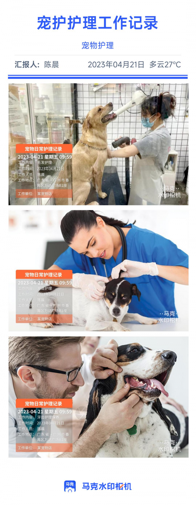 宠托师上门陪伴玩耍经常会拍照记录工作过程,而一般的拍照软件,照片多且不好保存,整理也麻烦。用马克水印相机拍照,照片自带时间地点等不可修改的水印信息,同时照片自动上传云端保存,节约成本。并且,照片上的水印信息可以让宠物主人更清楚工作过程,提升满意度与信任。