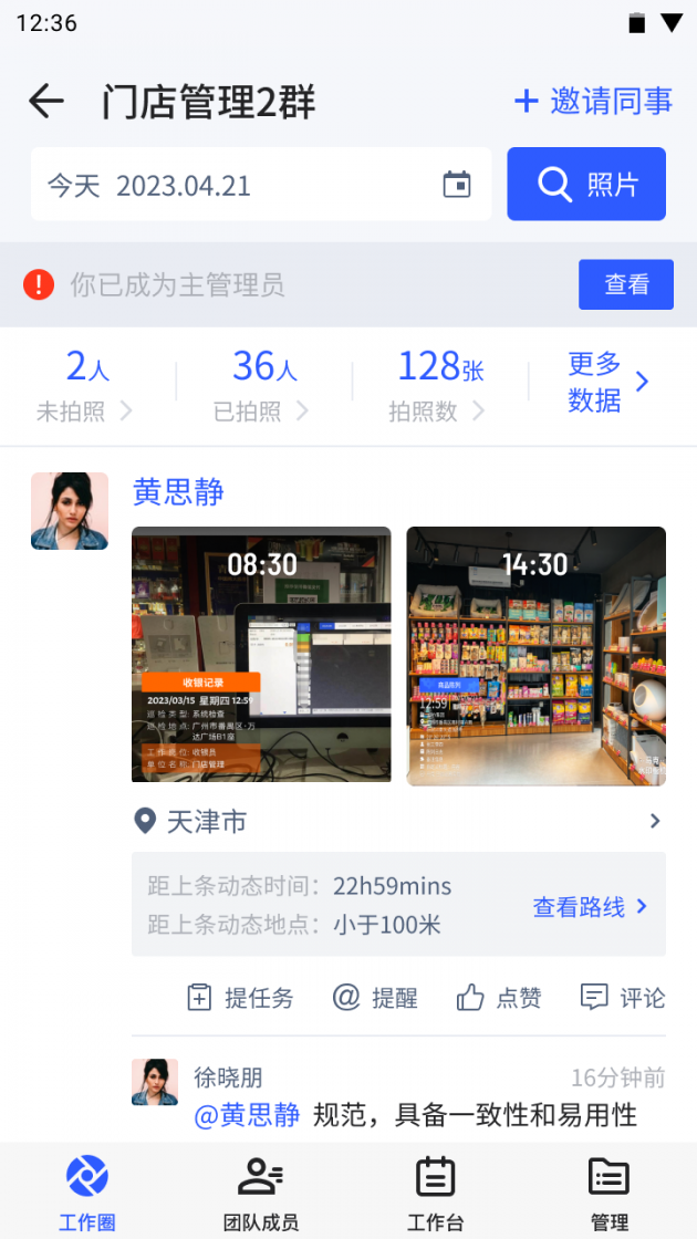 马克水印相机特有的团队工作圈,可用于日常工作照片的上传。照片会实时同步到工作圈,实现即时共享,工作的相关照片就像朋友圈一样展示,显示时间、人名、内容,可查看或下载相应的照片,也可以对某个照片进行评论提出修改意见,更有利于工作的开展和事件的溯源。值得一提的是,工作人员在做工作汇报时往往会把照片分享到微信、工作软件,这样很容易被其它消息刷走,而且翻查很麻烦,马克水印相机特有的团队工作圈可以解决这类问题。