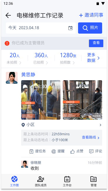 在团队管理上,通常无法对人员进行有效管理,无法实时对人员进行监督,因此工作效率一直持续下滑,马克水印相机的团队工作圈就可以解决这类问题。马克水印相机拍摄的照片可以自动同步团队,并且水印照片自动同步团队后,再也不用在工作群里面刷图和找图了。只需要翻看团队的照片即可了解当日的工作情况,并且团队内还可以进行任务的指派,使得整个工作环境形成闭环,每件事情都能轻松跟进。