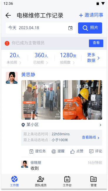 在团队管理上,通常无法对人员进行有效管理,无法实时对人员进行监督,因此工作效率一直持续下滑,马克水印相机的团队工作圈就可以解决这类问题。马克水印相机拍摄的照片可以自动同步团队,并且水印照片自动同步团队后,再也不用在工作群里面刷图和找图了。只需要翻看团队的照片即可了解当日的工作情况,并且团队内还可以进行任务的指派,使得整个工作环境形成闭环,每件事情都能轻松跟进。