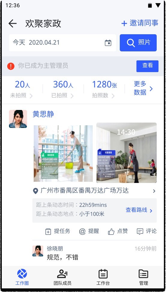 马克水印相机拍摄的照片可以自动同步团队,很好的解决照片甩微信群,很乱不容易查找的痛点。只需要翻看团队的照片即可了解当日的工作情况,并且团队内还可以进行任务的指派,使得整个工作环境形成闭环,每件事情都能轻松跟进。值得一提的是,我们在做工作汇报时往往会把照片分享到微信、工作软件,这样很容易被其它消息刷走,而且翻查很麻烦,马克水印相机特有的团队工作圈可以解决这类问题。