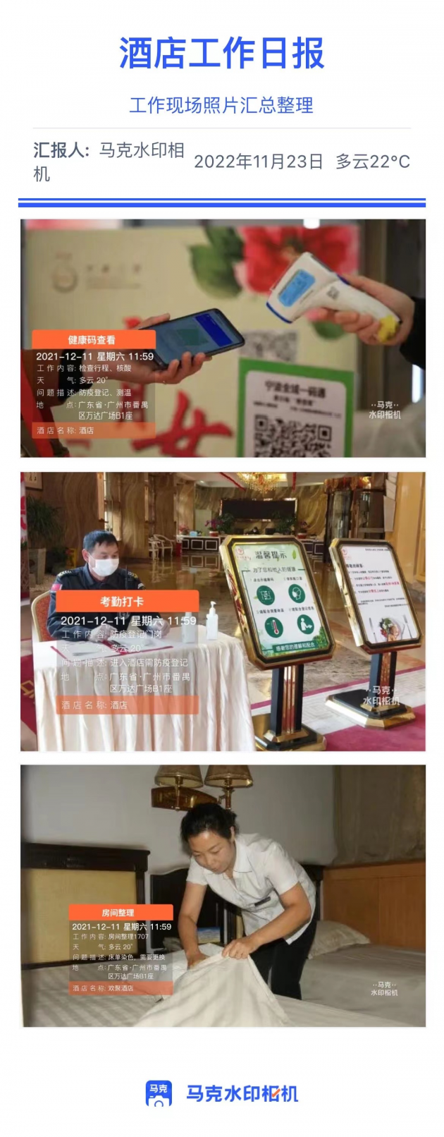 沈经理管理十几个清洁工,要求他们在规定的时间内按要求打扫房间,并且打扫完之后还需拍照记录,但由于一般的拍照软件,无法保证照片的真实性,沈经理常常需要花很多时间核实,导致工作效率低下。后使用马克水印相机拍照,照片自带时间地点等水印信息,并且不可以修改,还能实时上传云端,沈经理可在线查看,大大提升管理效率。