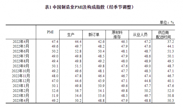 供应商配送时间指数为50.3%,比上月下降0.5个百分点,仍高于临界点,表明制造业原材料供应商交货时间持续加快。