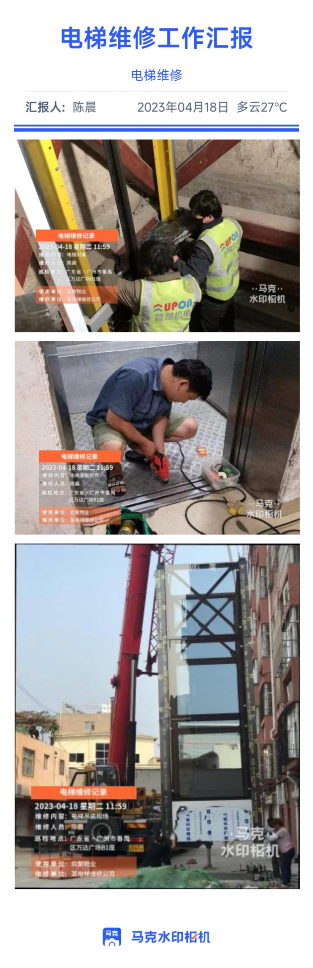 电梯企业想要监督维保师傅故障排除的过程,其实可以用马克水印相机管理。用马克水印相机拍照,照片自带时间地点等水印信息,并且照片能够自动上传云端保存,大大提升工作效率。