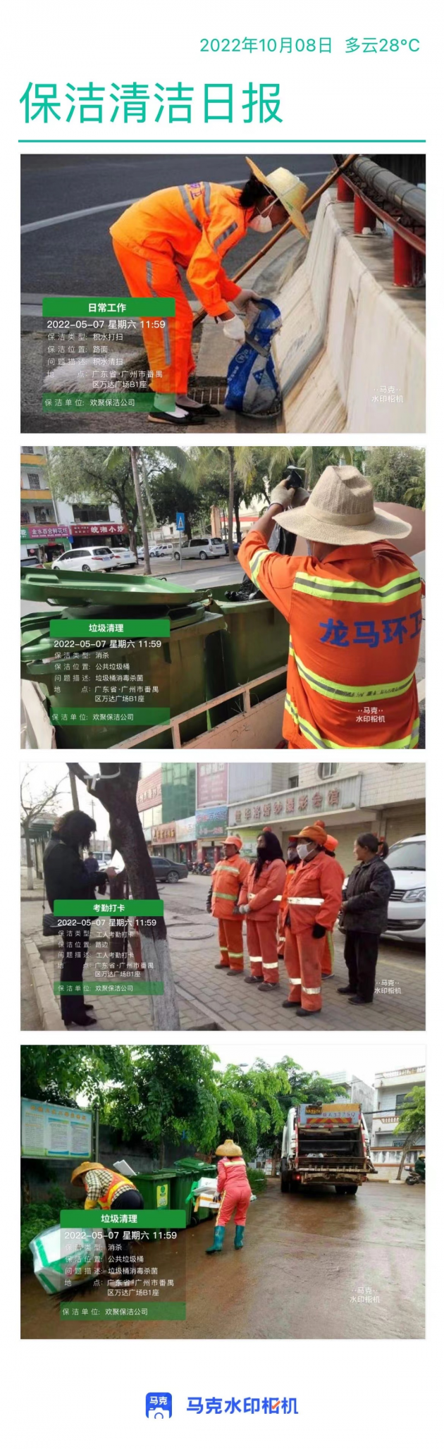 广州某街道办,借助马克水印相机对环卫工人工作过程进行监工,同时以拍照打卡代替传统的考勤方式,管理效率提高了,管理成本下降了。同时,把日常工作照片一键生成宣传图,进行线下活动宣传,提升人们的环境卫生意识 ,让各多人加入环保工作,共同维持良好的生活环境。
