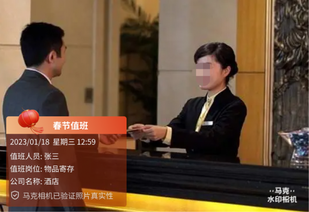 为了解决这个问题,酒店管理层可以使用马克水印相机来管理值班人员,要求值班人员拍照记录工作现场,照片自带不可修改的时间地点等水印信息,通过水印信息来辨别值班人员是否履行了工作职责,大大提升管理效率。