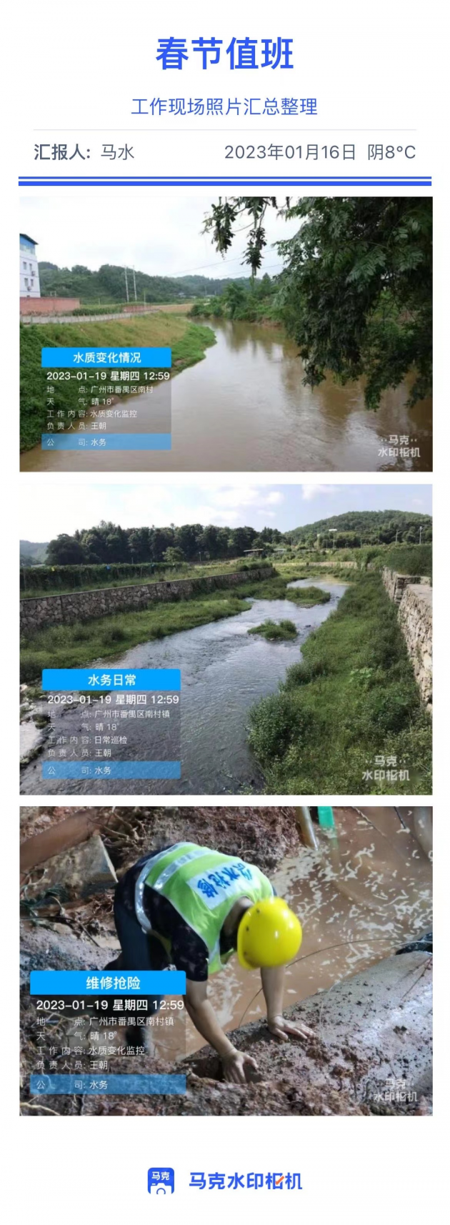 某供水公司要求春节期间值班人员时需要进行工作汇报,因此,很多值班人员都是拍照发群里,但是这种方法存在两个弊端,一是照片真假无法核实,二是照片杂乱无章,不好查看。后用马克水印相机管理,拍照自带时间地点等水印信息,确保真实性,同时照片根据水印信息自动上传云端保存,实时共享团队成员。
