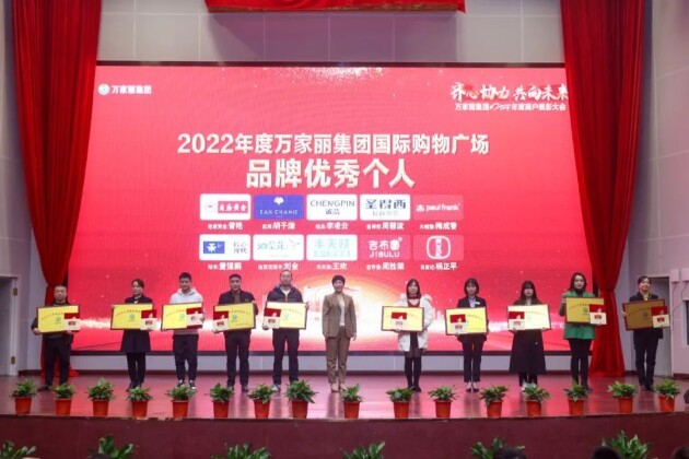 万家丽集团国际购物广场总经理戴娥英女士为2022年度万家丽集团国际购物广场品牌优秀个人颁奖:老庙黄金:曾艳、奕辰:胡子漩、诚品:李凌云、圣得西:周碧波、大嘴猴:梅成香、祐禾:董强鹏、油菜花院子:刘全、半天妖:王欢、吉布鲁:周胜荣、肖友记:杨正平。