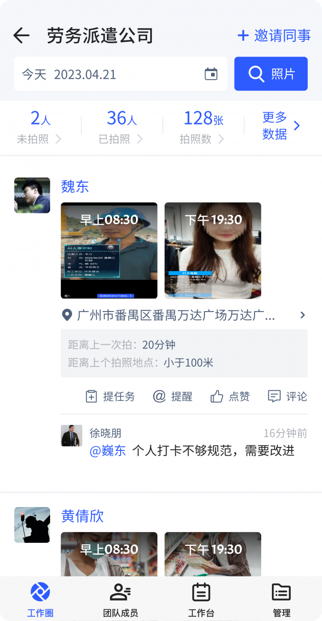 劳务派遣员工经常需要记录工作细节,方便反馈给领导。一般是拍照记录的方式,然而一般的拍照软件,照片管理很麻烦,而用马克水印相机,拍照自带时间地点等水印信息,并且可实时同步团队成员,节省时间。