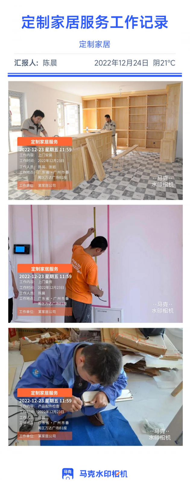 某定制家居公司要求师傅安装家居时,需要拍照记录安装过程,但是由于数量多,导致照片管理耗费时间多,效率低下。后用马克水印相机管理,照片自带时间地点等不可修改的水印信息,并且可根据水印信息自动上传云端分类保存,大大提升管理效率。