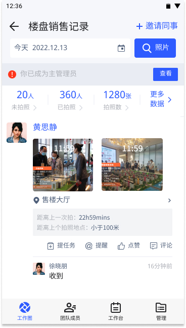 在团队管理上,通常无法对人员进行有效管理,无法实时对人员进行监督,因此工作效率一直持续下滑,马克水印相机的团队工作圈就可以解决这类问题。马克水印相机拍摄的照片可以自动同步团队,并且水印照片自动同步团队后,很好的解决照片甩微信群,很乱不容易查找的痛点。只需要翻看团队的照片即可了解当日的工作情况,并且团队内还可以进行任务的指派,使得整个工作环境形成闭环,每件事情都能轻松跟进。