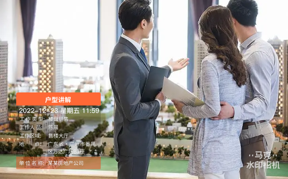 楼盘经纪人工作过程管理常用的工具有水印相机,其中马克水印相机是用得最多的。马克水印相机拍照自带时间地点等水印信息,并且照片能够实时上传云端同步团队成员,管理人员可在线查看。