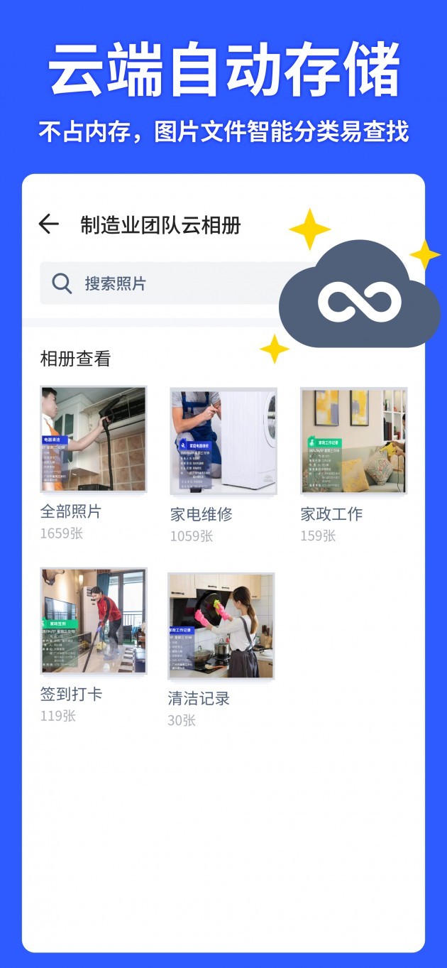 在把工作照存在手机里,时间久了手机内存就会不足,并且查找起来十分不便,针对这一类问题,马克水印相机的云端储存功能将有效解决空间不足等情况。拍的高清照片、视频都会自动、免费存储到云端,并且这些都会根据水印类型、水印信息进行自动的分类存储,不但不占手机内存,而且特别容易查找,通过水印上的信息可以进行查找,非常方便。