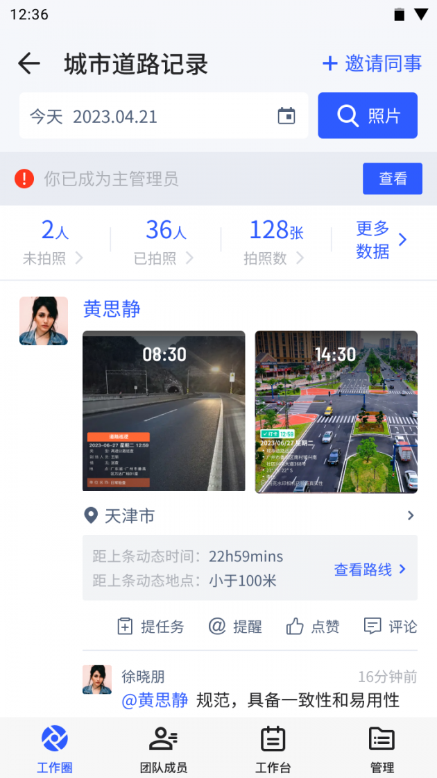 在日常工作中,经常要拍照报备自己的工作情况,但是人数太多照片容易丢失或查找不便,工作汇报成为员工负担,对此,马克水印相机的团队工作圈可以有效解决这类工作汇报问题。只需要使用马克水印相机拍照,照片就会自动实时同步到工作圈,并且这些照片会自动分析成各种数据,照片都可以存储到团队的相册内,为日后工作的留存留证,追溯工作的源头留下影像。