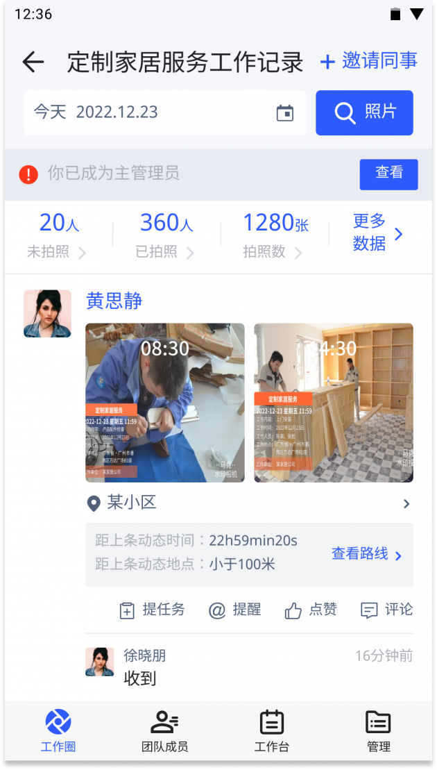 将同事拉近工作圈后,他们只需要使用马克水印相机拍照,照片就会自动实时同步到工作圈,并且这些照片会自动分析成各种数据,如员工拍照数据、考勤打卡数据、排班数据等等,而且上传的照片都可以查看和下载,都是存储到团队的相册内的,为日后工作的留存留证,追溯工作的源头留下影像。并且管理员可以看到团队内的工作情况、照片,方便进行工作的交流。
