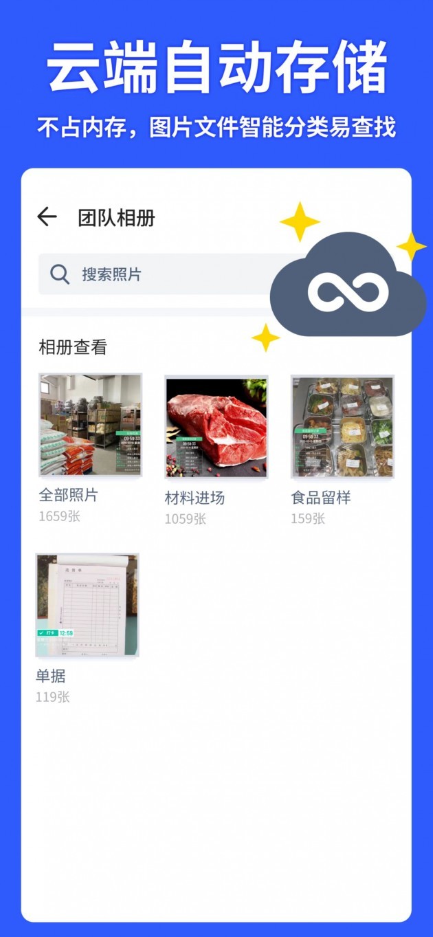不管是手机拍照,还是相机拍照,最终相信大家在一个地方来存储。只是照片多了,想要找照片的话会非常麻烦。对于餐饮行业更是如此,然而,马克水印相机的云端实时储存,照片自动归类功能可以有效解决这一类问题。马克水印相机拍摄的高清照片都会自动永久免费存储在云端,不占用手机内存,并且这些照片能够根据水印的信息进行自动的分类,也可以根据水印信息进行查找搜寻,极大提升了效率。