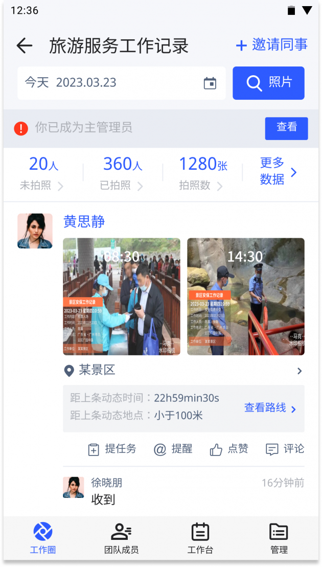 某旅游景点,要求清洁工人卫生管理时都要拍照发微信群,由于每天图片非常多,管理人员经常需要花费很多时间整理,导致效率低下。用了马克水印相机管理后,不用再花时间整理图片,效率大大提升。用马克水印相机拍照,照片上自带时间地点等水印信息,并且可根据水印信息分类上传云端保存,节省成本。