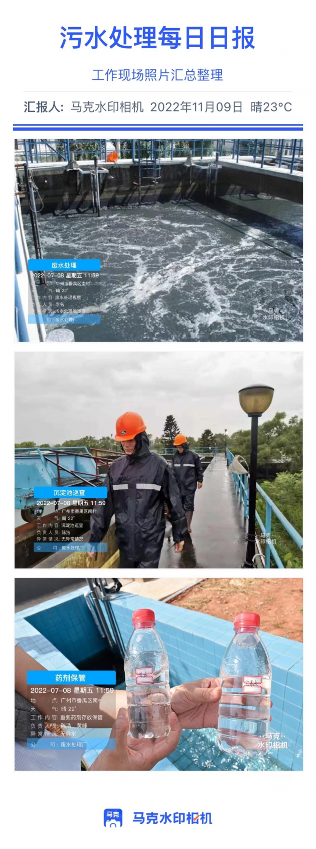 流量流速记录是污水处理过程中的重要工作,过高过低对污水处理都有比较大的影响。而技术人员常用的记录方式就是拍照记录。用马克水印相机,拍照自带真实可靠的时间地点等信息,并且还能根据这些信息自动上传云端永久保存,不占内存。
