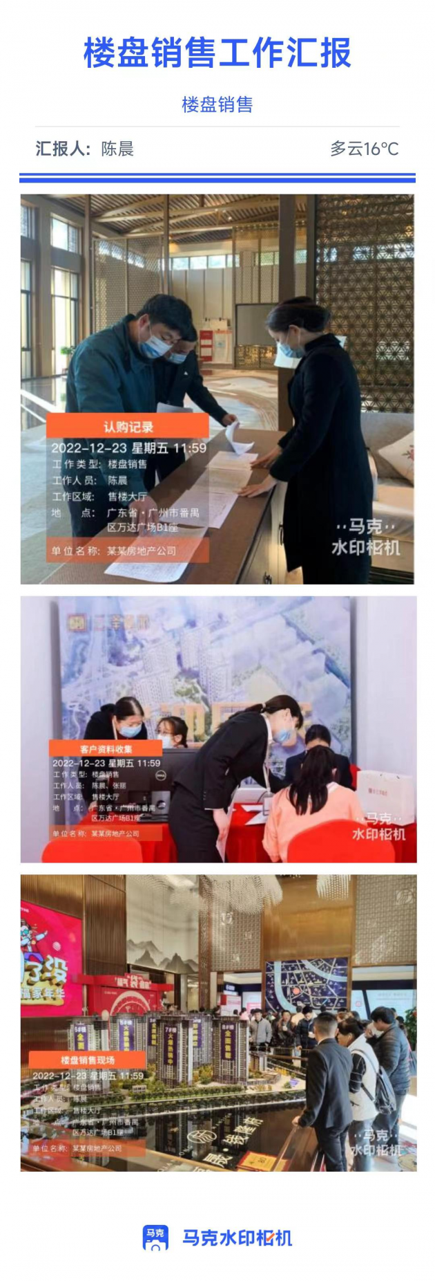 某楼盘管理人员想要了解楼盘案场销售的工作情况,基本都是通过案场销售自己汇报,不能更客观的评估实际工作情况。后用马克水印相机管理,要求案场销售对工作进行拍照记录,照片自动上传云端,实时保存,管理人员可在线查看,及时给出建议。
