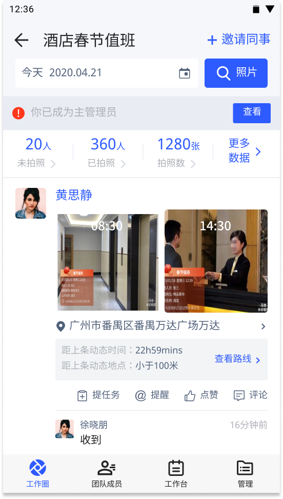 将同事拉近工作圈后,他们只需要使用马克水印相机拍照,照片就会自动实时同步到工作圈,并且这些照片会自动分析成各种数据,如员工拍照数据、考勤打卡数据、排班数据等等,而且上传的照片都可以查看和下载,都是存储到团队的相册内的,为日后工作的留存留证,追溯工作的源头留下影像。并且管理员可以看到团队内的工作情况、照片,方便进行工作的交流。