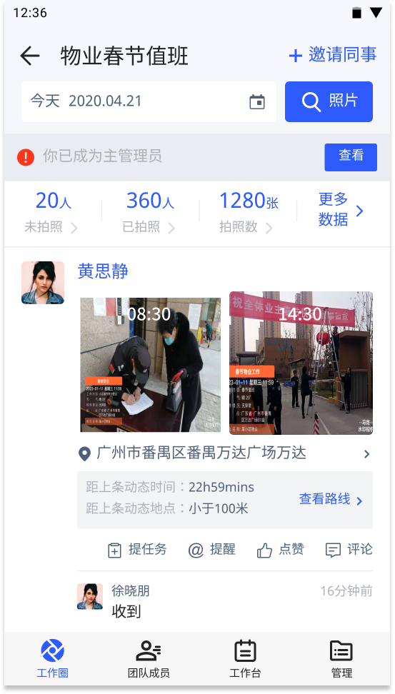 将同事拉近工作圈后,他们只需要使用马克水印相机拍照,照片就会自动实时同步到工作圈,并且这些照片会自动分析成各种数据,如员工拍照数据、考勤打卡数据、排班数据等等,而且上传的照片都可以查看和下载,都是存储到团队的相册内的,为日后工作的留存留证,追溯工作的源头留下影像。并且管理员可以看到团队内的工作情况、照片,方便进行工作的交流。