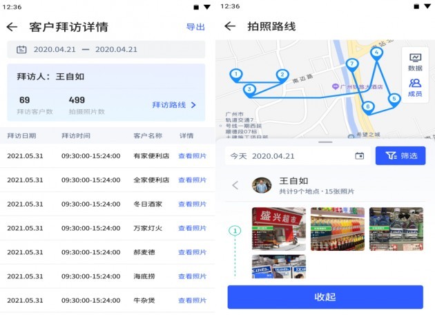 快消公司的业务员在做终端铺货的时候,需要在到店的时候对店铺、位置、时间做好记录,马克水印相机自带时间、地点以及门头识别,简易CRM系统,可以在进店时拍摄照片就能够识别门头信息并且记录下当下的时间、地点,且均不可修改,可作为真实的工作证明,同时到店的记录会实时同步到后台简易的CRM系统中,会清晰记录店铺名称、到访人、到访时间、地点、到访次数等信息,方便做客户关系的管理和维护。
