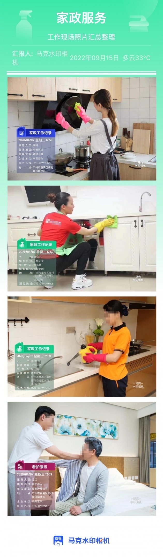 家电维修清洗是比较专业的工作,很多家庭无法自已清洗,所以会找专业的人员清洗。而家政公司会要求上门清洗的工作人员拍照汇报工作,因此导致照片很多,不管管理,容易出现作假的情况。用马克水印相机拍照不仅可以杜绝这种情况,还能提高管理效率,让照片不再满天飞。