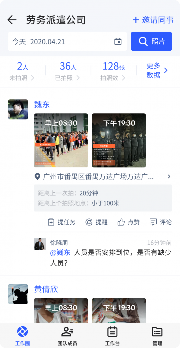 在日常工作中,经常要拍照报备自己的工作情况,但是人数太多照片容易丢失或查找不便,工作汇报成为员工负担,对此,马克水印相机的团队工作圈可以有效解决这类工作汇报问题。只需要使用马克水印相机拍照,照片就会自动实时同步到工作圈,并且这些照片会自动分析成各种数据,而且上传的照片都可以查看和下载,并且存储到团队的相册内,为工作留痕留证,以及方便日后追溯工作源头。