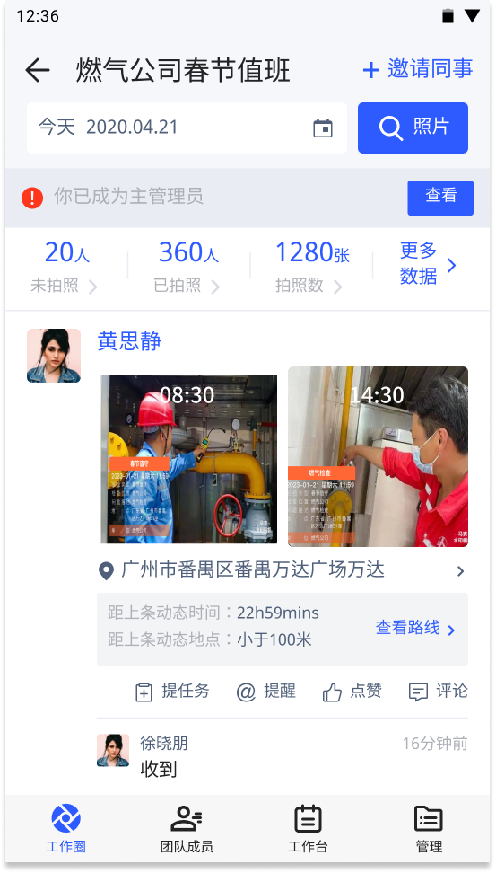 马克水印相机拍摄的照片可以自动同步团队,并且水印照片自动同步团队后,再也不用在工作群里面刷图和找图了。只需要翻看团队的照片即可了解当日的工作情况,并且团队内还可以进行任务的指派,使得整个工作环境形成闭环,每件事情都能轻松跟进。在传统团队管理中,人员时常要拍照报备自己的工作情况,但是人数太多照片容易丢失或查找不便,工作汇报成为员工负担,对此,马克水印相机的团队工作圈可以有效解决这类工作汇报问题。