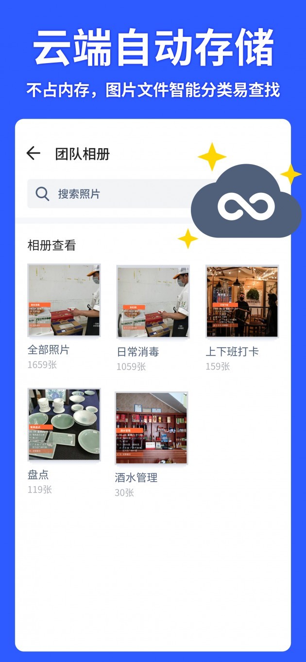 马克水印相机拍摄的照片会实时同步上传到云端,而且系统会根据水印上的信息进行分类,也可以根据这些水印信息进行查找和搜索,对于影像的管理效率提升起到极大的作用,而且水印的照片都是会一直存储在云端,不限制下载时间、不限制查看时间,免费可用。不管是手机拍照,还是相机拍照,最终相信大家在一个地方来存储。只是照片多了,想要找照片的话会非常麻烦。对于餐饮行业更是如此,然而,马克水印相机的云端实时储存,照片自动归类功能可以有效解决这一类问题。