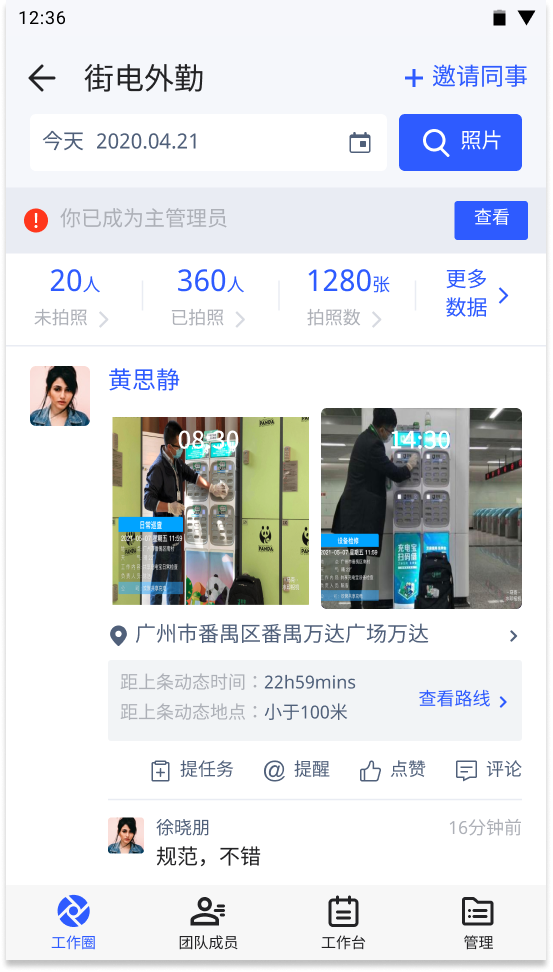 马克水印相机特有的团队工作圈,可用于日常工作照片的上传。马克水印相机拍摄的照片会实时同步到工作圈,工作的相关照片就像朋友圈一样展示,显示时间、人名、内容,可随时查看或下载相应的照片,也可以对某个照片进行评论提出修改意见,更有利于工作的开展和事件的溯源。值得一提的是,工作人员在做工作汇报时往往会把照片分享到微信、工作软件,这样很容易被其它消息刷走,而且翻查很麻烦,马克水印相机特有的团队工作圈可以解决这类问题。